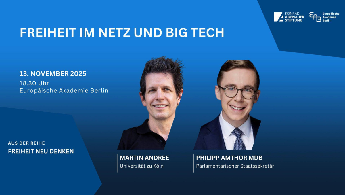 Wir laden Sie herzlich zur Abschlussveranstaltung dieser Reihe zum Thema „Freiheit im Netz und Big-Tech„ ein und möchten mit Ihnen ins Gespräch kommen über die Rolle der Big-Tech-Unternehmen für die Meinungsfreiheit. Was bedeutet es, wenn Plattformen selbst über Regeln und Grenzen der Äußerung entscheiden? Und wie können wir ein ausgewogenes Verhältnis von Regulierung und Freiheit gestalten?