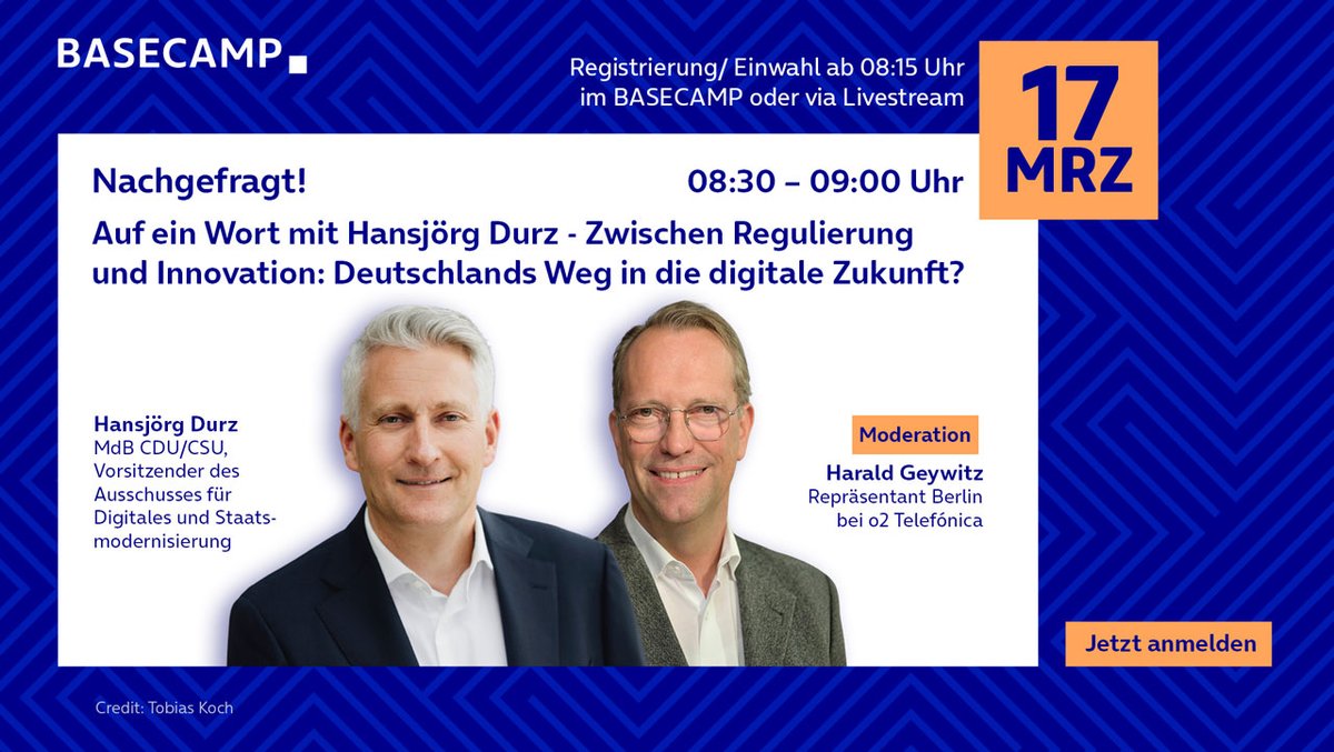 Im Rahmen unserer nächsten Ausgabe von „Nachgefragt!“ am 17. März 2026 sprechen wir mit Hansjörg Durz, dem Vorsitzenden des Ausschusses für Digitales und Staatsmodernisierung. Ein Jahr nach der Bundestagswahl wollen wir herausfinden, was auf der Agenda des zweiten Jahres der Regierung Merz digitalpolitisch steht und darüber diskutieren, wie Deutschland im Spannungsfeld von Regulierung und Innovation handlungsfähiger werden kann. Im Mittelpunkt stehen der Abbau übermäßiger Bürokratie, die Modernisierung staatlicher Strukturen und die Frage, wie Deutschland seine digitale Souveränität und seine Infrastrukturen nachhaltig stärken kann.