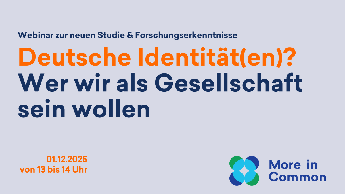 Um diesen Fragen nachzugehen, haben wir von More in Common von Mai bis Juli 2025 gemeinsam mit unserem Forschungspartner Verian über 2.000 Menschen aus der erwachsenen deutschsprachigen Wohnbevölkerung qualitativ und quantitativ befragt. Uns interessierten die Selbst- und Deutschlandbilder der Menschen, was ihnen Halt und Orientierung in dieser Gesellschaft gibt, und welche Zukunftsbilder für unser Land sie teilen.