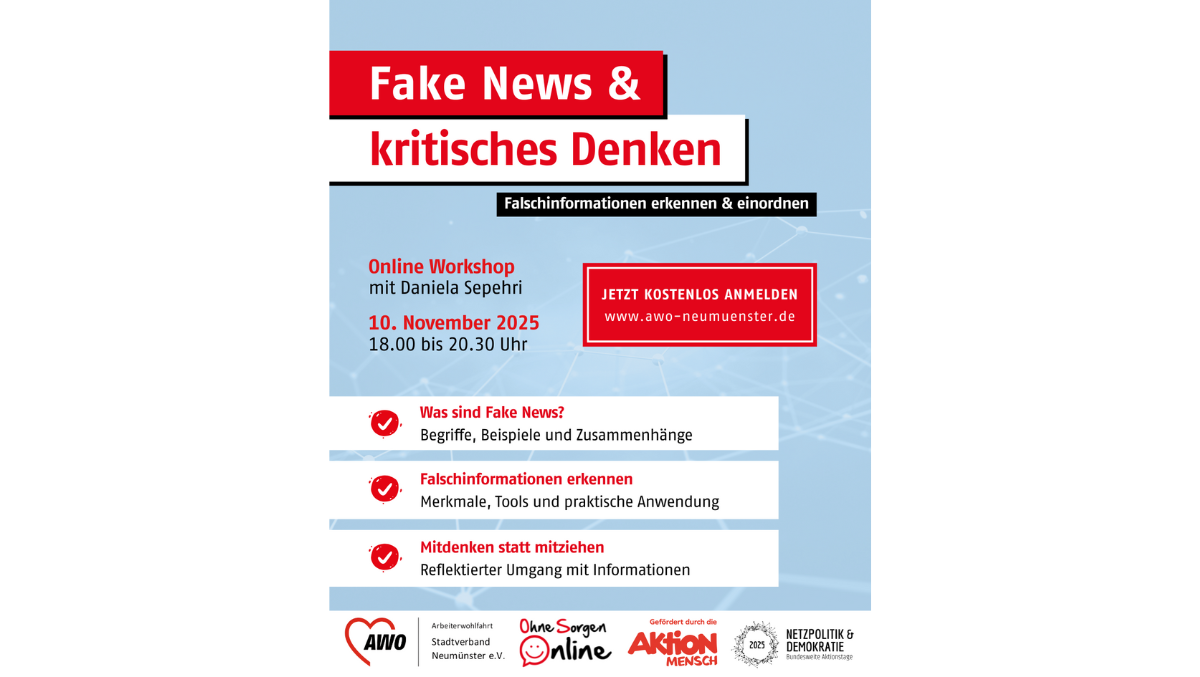 Am 10. November 2025 laden wir herzlich zu einem Online-Workshop rund um das Thema Desinformation ein. Von 18:00 bis 20:30 Uhr setzen wir uns gemeinsam mit den Mechanismen von Falschnachrichten auseinander und zeigen, wie man Desinformation im Netz erkennen und einordnen kann.