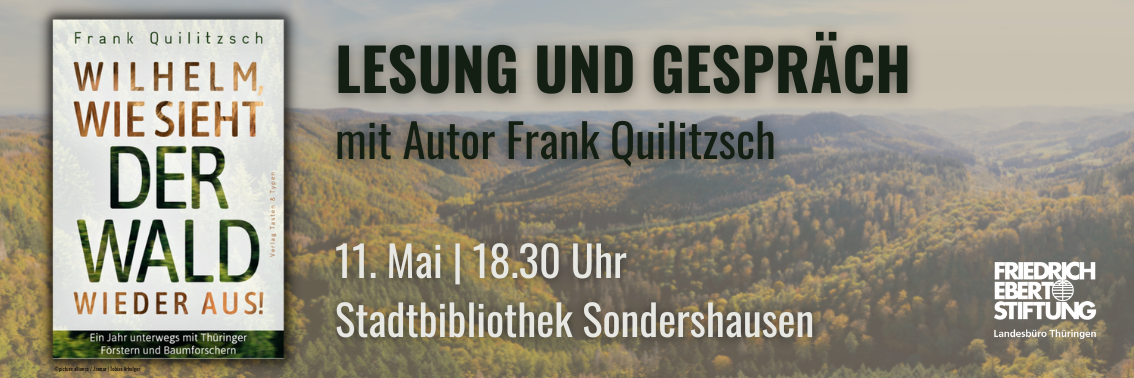 Wir laden Sie herzlich ein, am 11. Mai 2023 um 18.30 Uhr in der Stadtbibliothek Sondershausen mit dem Autor Frank Quilitzsch und seinem Gast, Forstamtsleiter Uli Klüßendorf, ins Gespräch zu kommen und über Themen wie der Wald, Klimawandel, nachwachsende Rohstoffe oder auch Tourismus zu diskutieren.