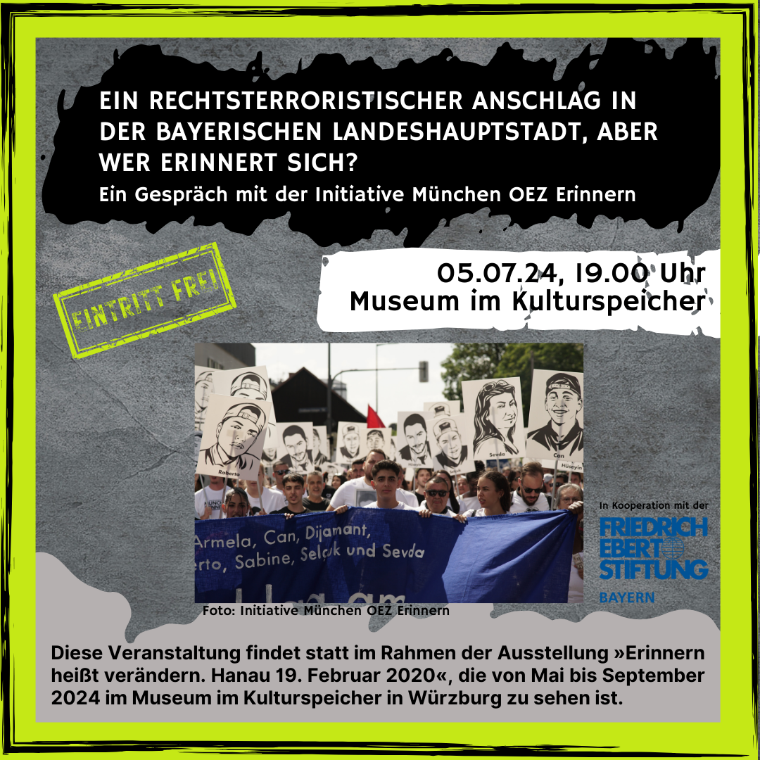 München OEZ Erinnern – so heißt die Initiative, die sich sechs Jahre nach dem Anschlag am OEZ gründete. Ein Zusammenschluss aus Angehörigen, Überlebenden und aktiven Unterstützenden. Gemeinsam soll der Abend im MiK genutzt werden, um über den rechten Terror am OEZ aufzuklären. Außerdem werden die Pläne der Initiative zum achten Jahrestag am 22.07.2024 vorgestellt.