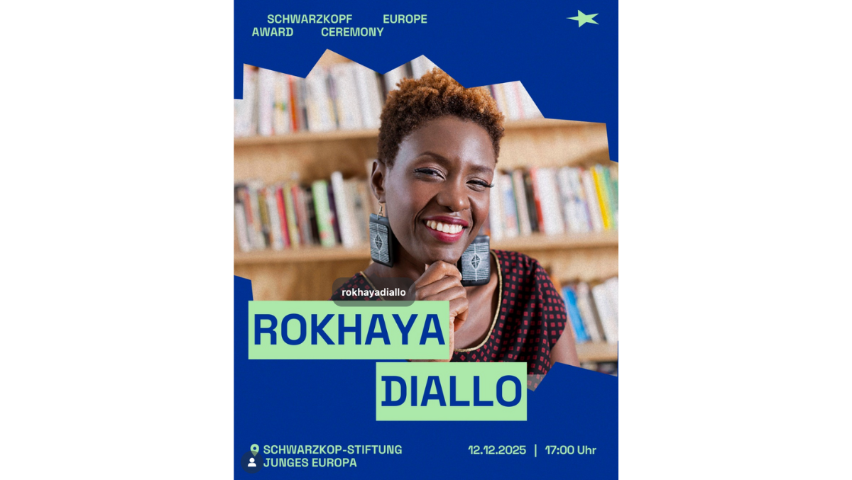 Wir freuen uns sehr, Sie zur Preisverleihung des Schwarzkopf-Europa-Preises an Rokhaya Diallo einzuladen. Die Veranstaltung findet am Freitag, den 12.12.2025, um 17:00 Uhr in der Schwarzkopf-Stiftung Junges Europa statt. Im Anschluss an die Preisverleihung erwartet Sie eine englischsprachige Gesprächsrunde mit Rokhaya Diallo zu zentralen Fragen ihrer Arbeit rund um Feminismus, antirassistische Perspektiven, Menschenrechte und gesellschaftlichen Wandel.