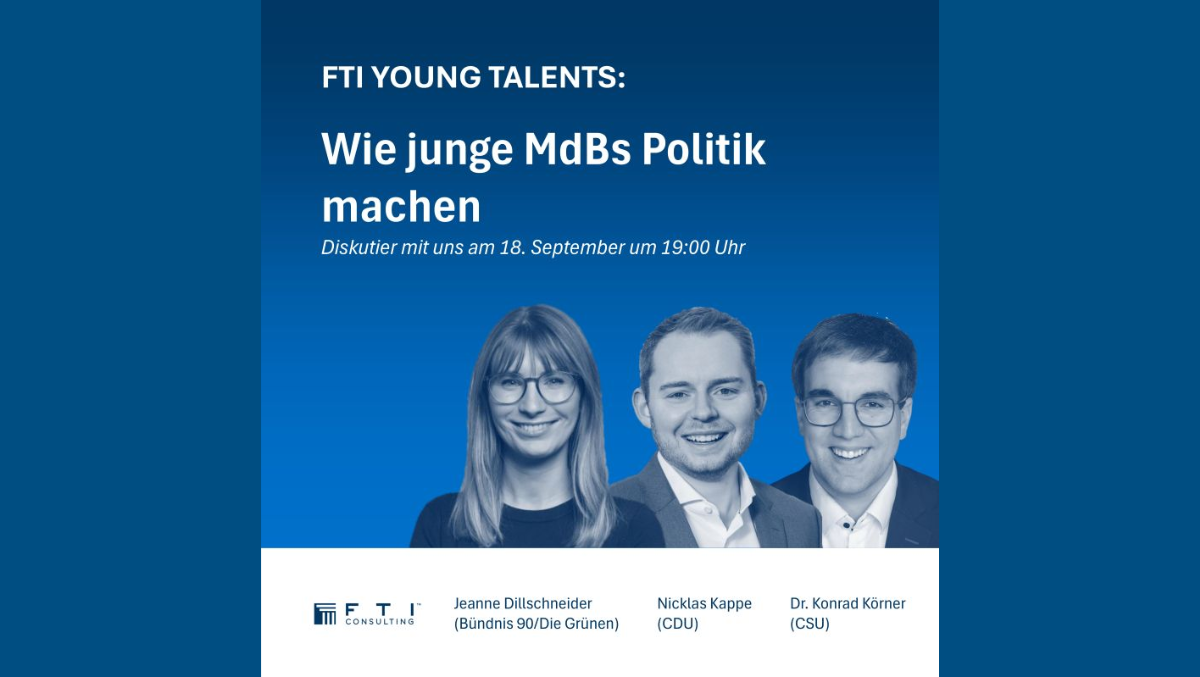 Diese Fragen und die Entwicklungen der 21. Legislaturperiode stehen im Mittelpunkt der dritten Ausgabe der FTI Young Talents Eventreihe am Donnerstag, 18. September 2025 in Berlin. Wir laden Dich herzlich ein, gemeinsam mit anderen Young Professionals und MdBs Nicklas Kappe (CDU), Dr. Konrad Körner (CSU) und Jeanne Dillschneider (Bündnis 90/Die Grünen) zu diskutieren. Die Teilnahme eines Vertreters der SPD ist angefragt.